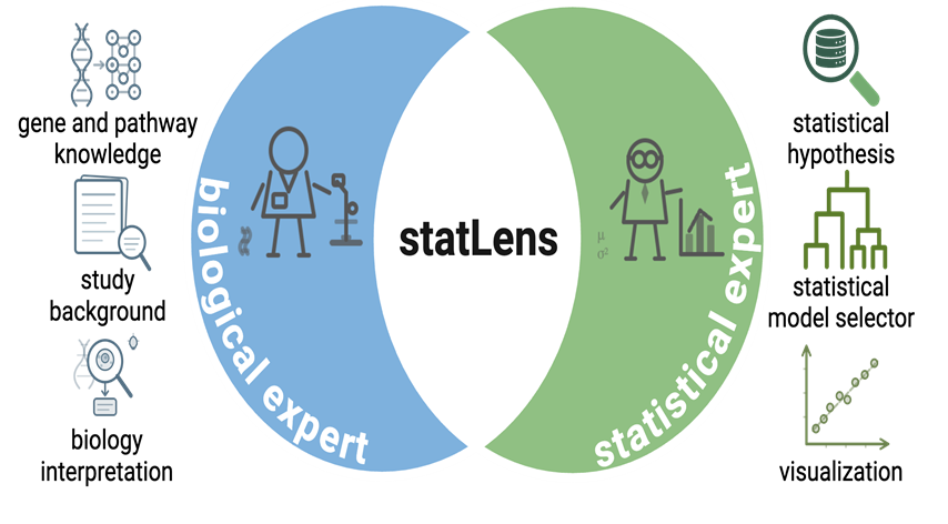 Researchers at GW developed statLens, a novel AI‑driven analytical framework that integrates multi-agentic Retrieval‑Augmented Generation (RAG), LLM‑based reasoning, design‑of‑experiments (DoE) interpretation, and a distribution‑aware statistical engine to generate, refine, and execute complete statistical workflows. statLens transforms natural‑language study descriptions, and its measurements (omics, clinical, patient or sample characteristics data) into testable hypotheses, formal model equations, and validated statistical outputs, all stored in a structured knowledge mart that enables closed‑loop, self‑improving analytical performance and domain knowledge. This unified architecture provides transparent, reproducible, and expert‑level statistical modeling across diverse biomedical and experimental domains.